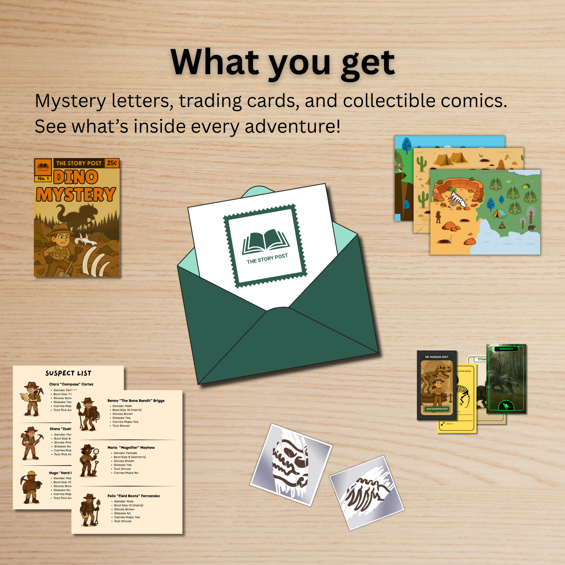 The letters reveal new “evidence”: fossil scratch cards, excavation maps, story snapshots and trading cards that bring the dig site to life. Letter by letter and piece by piece, the Titanorex comes together! In the last letter your child receives a mini full-color comic book capturing the entire thrilling excavation.