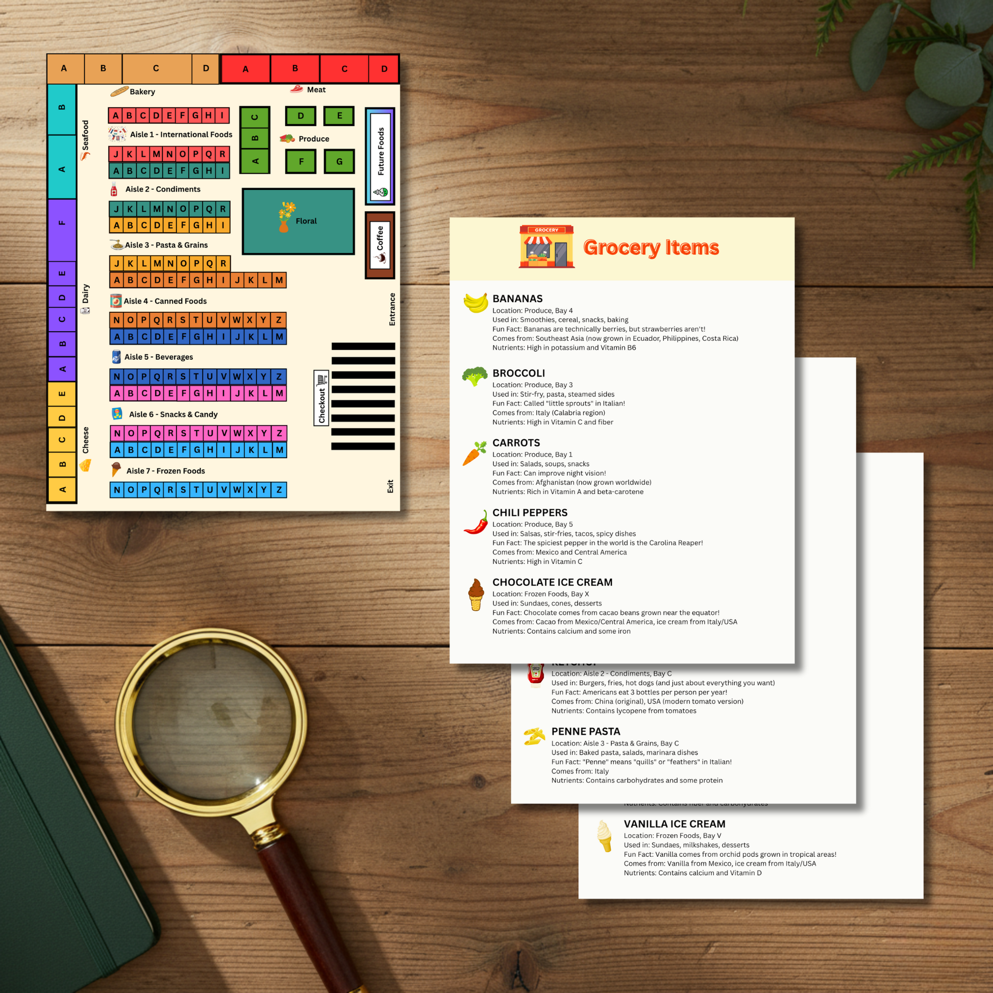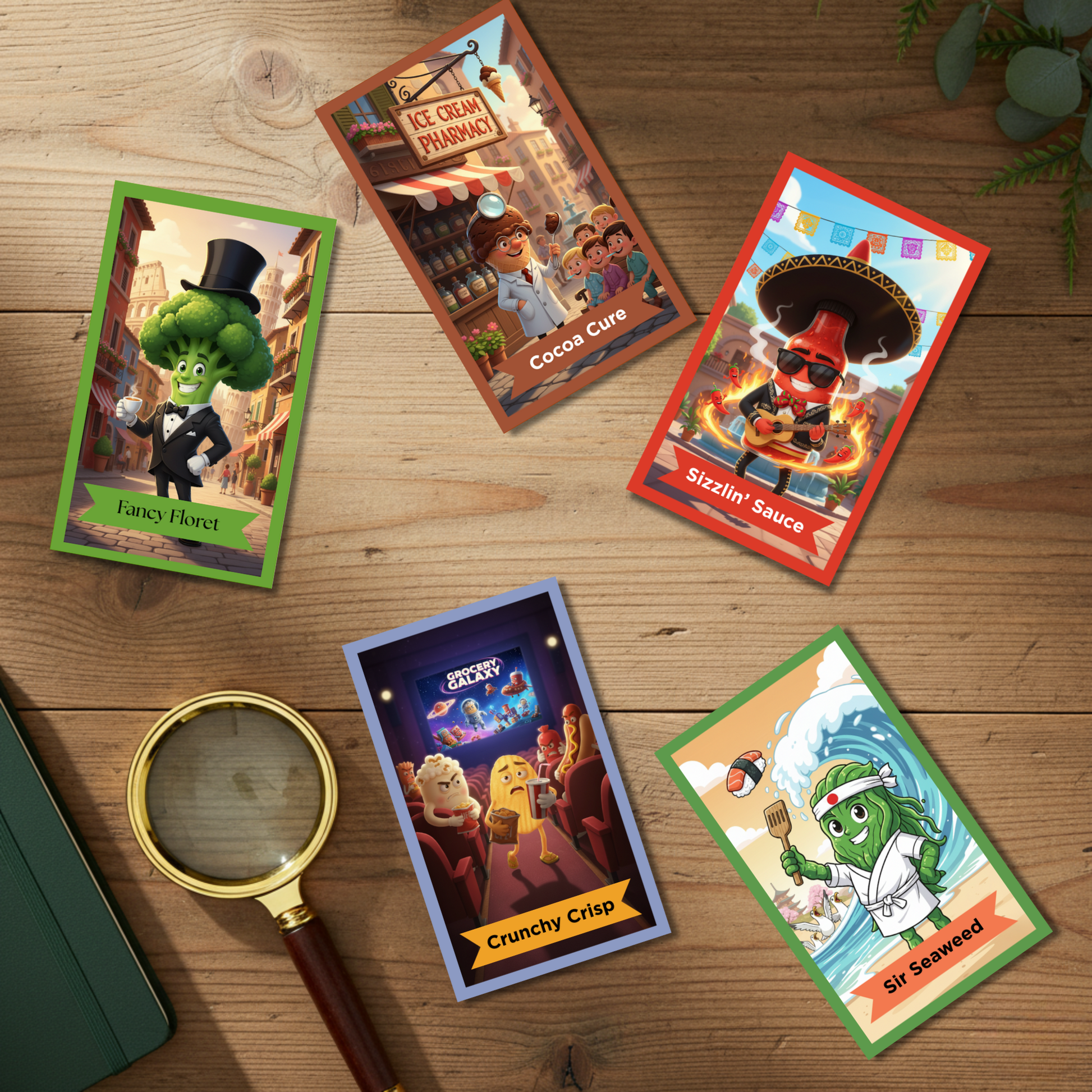 Each letter reveals new locations in the store with navigation maps, cultural food origin cards, futuristic clue cards and story moments that transform ordinary groceries into extraordinary discoveries. By the final letter, they'll have collected a complete set of trading cards showing foods from around the world and mastered the ultimate grocery store map!