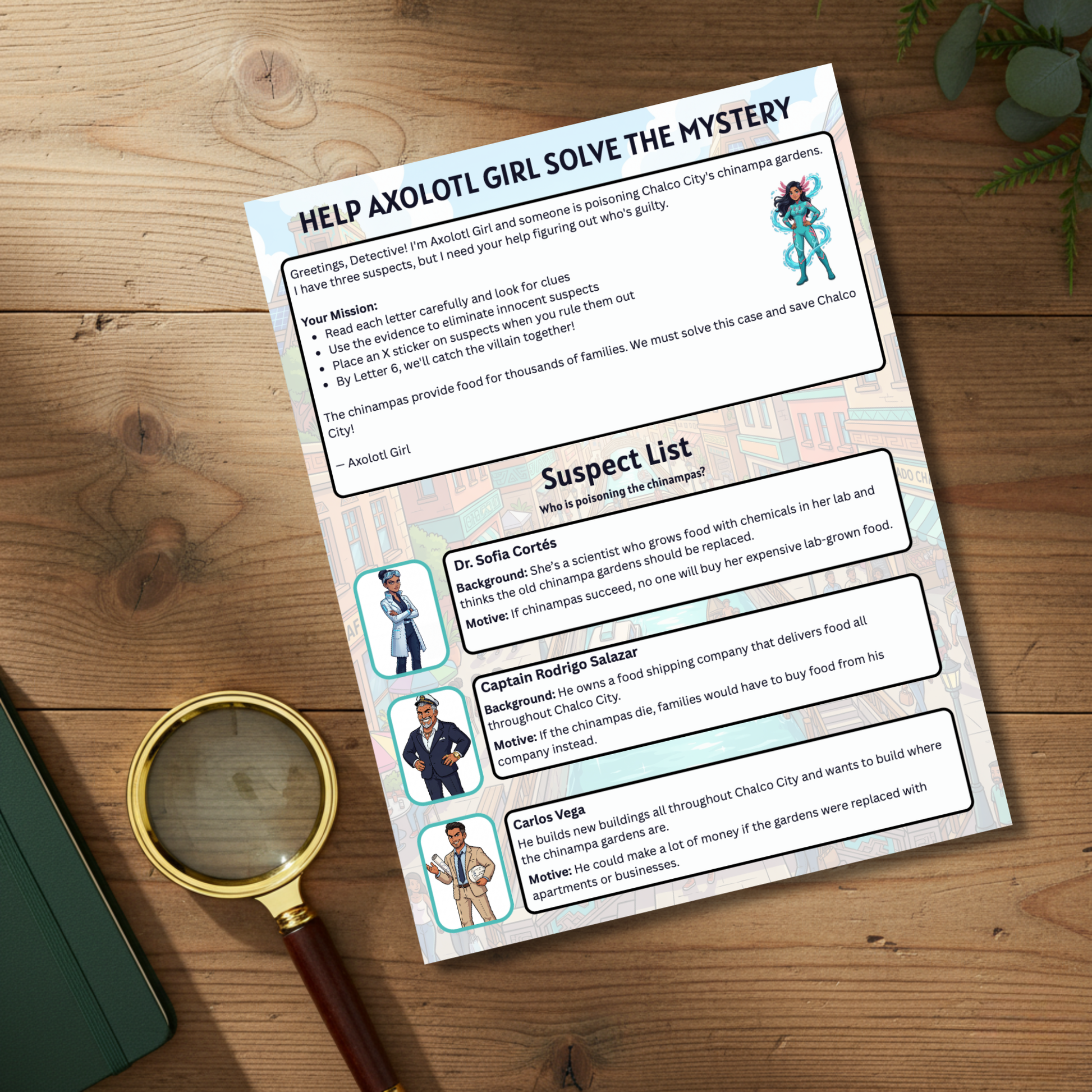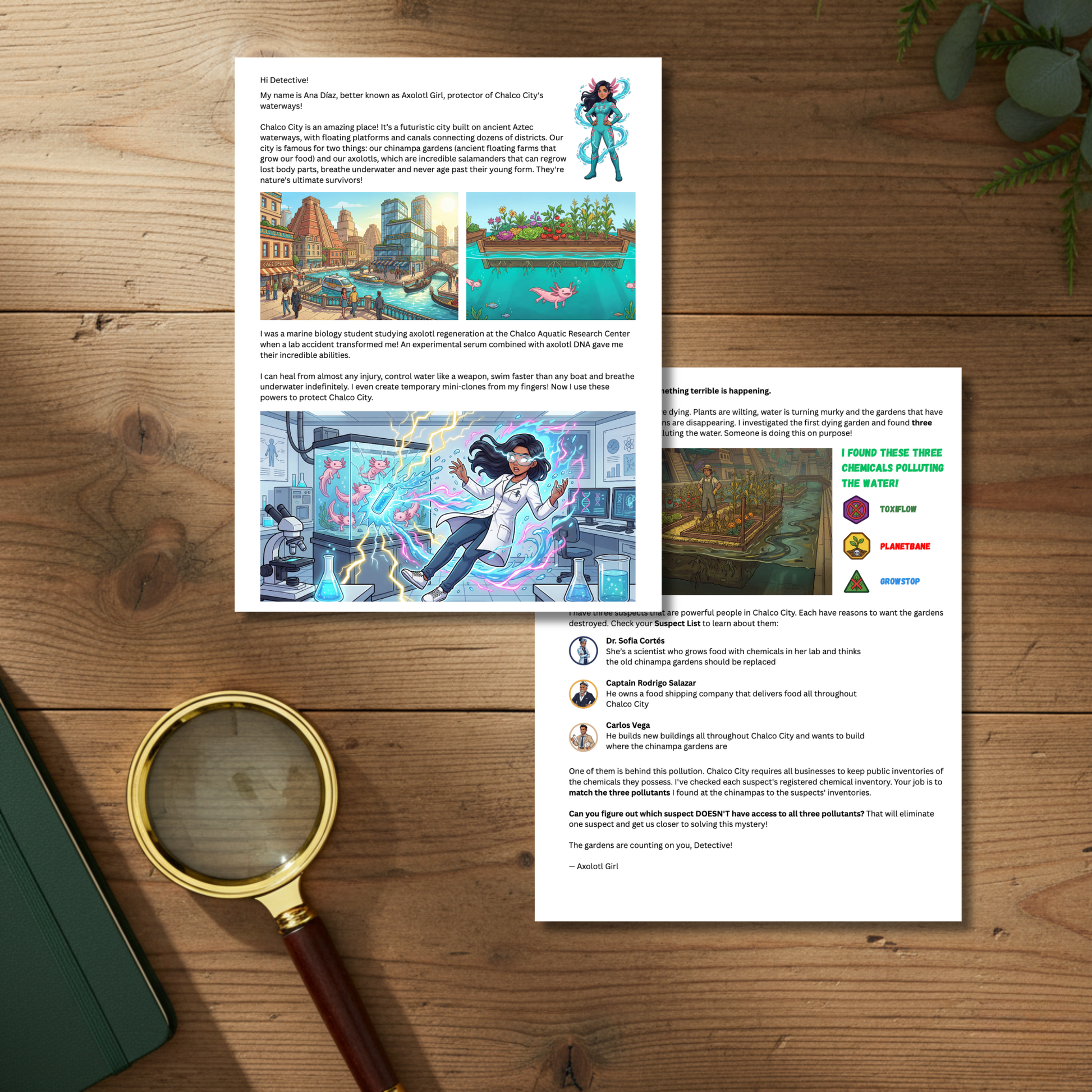 Each letter delivers new evidence: canal lock passage tickets to sequence and map the villain's route, chemical evidence cards identifying the pollutants, trading cards featuring Axolotl Girl's superpowers, and an Evidence Tracker to organize suspects and clues. By the final letter, they'll have traced the toxic trail through Chalco City's canals, identified the polluter and learned why protecting ancient ecosystems matters!